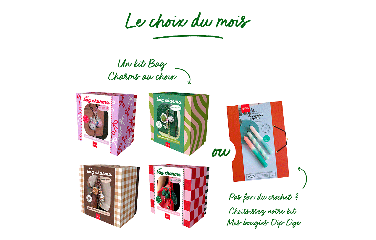 Chaque mois, vous pourrez personnaliser votre box en sélectionnant l’activité créative qui vous inspire le plus parmi plusieurs propositions, ou encore choisir entre différents modèles d’un même kit.