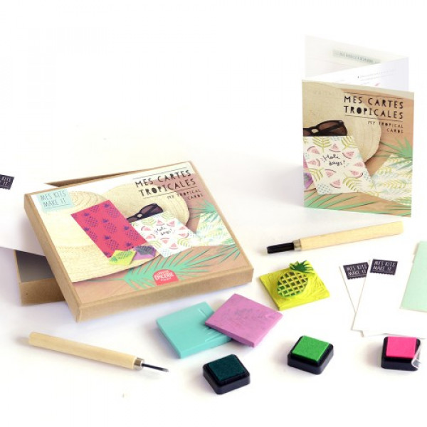 Ca sent les vacances ! Grâce à ce kit, créez vos propres cartes tropicales. Sculptez vos gommes afin d'en faire des tampons, trempez-les dans les encreurs et le tour est joué !