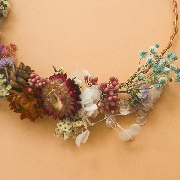 Vous trouverez à l'intérieur de cette box créative tout le nécessaire pour fabriquer une magnifique couronne décorative en fleurs séchées.