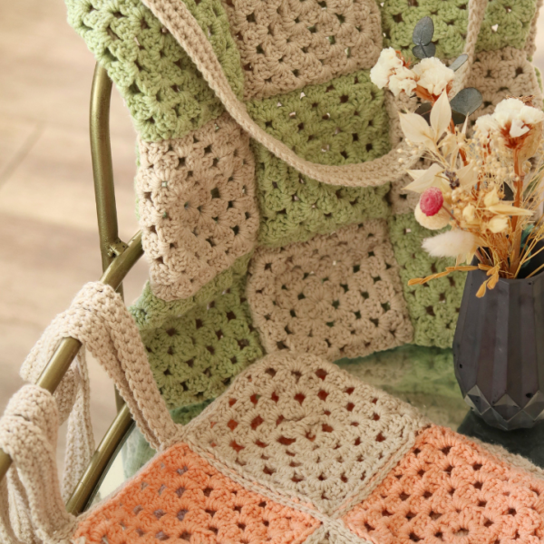 Très tendance en ce moment, un carré granny est une pièce de tissus carrée réalisée au crochet en travaillant du centre vers l’extérieur. Une fois les petits carrés crochetés, ils seront ensuite cousus ensemble par des cercles successifs pour donner un joli sac !