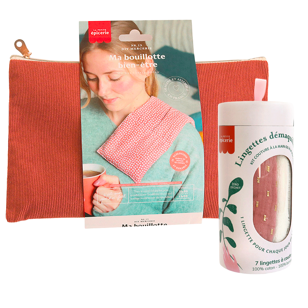 Découvrez nos 7 lingettes démaquillantes écologiques 100% coton et bambou, et une bouillotte sèche à réaliser avec ces deux kits mercerie facile à réaliser. Des coloris et un design doux (en couleurs aléatoires), qui vous apporterons un cocon de bien-être !