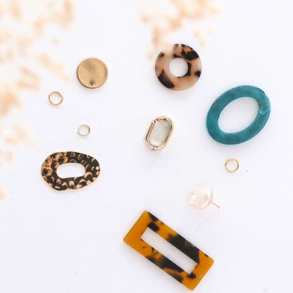 Ce kit vous propose de multiples possibilités pour réaliser 3 paires de maxi boucles d'oreilles à l'esprit vintage. Des tons roses, verts et écailles qui se mélangent parfaitement à des éléments dorés. Martelées, graphiques, arrondies ou rectangulaires, à vous de combiner les formes pour créer vos modèles favoris.