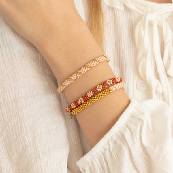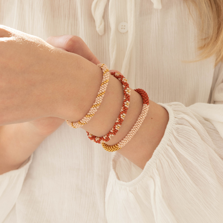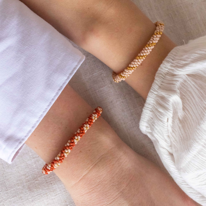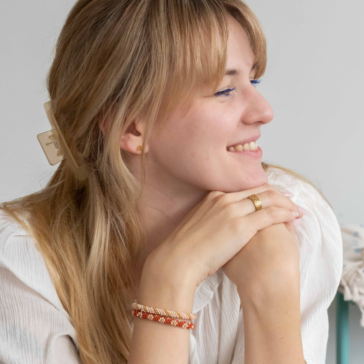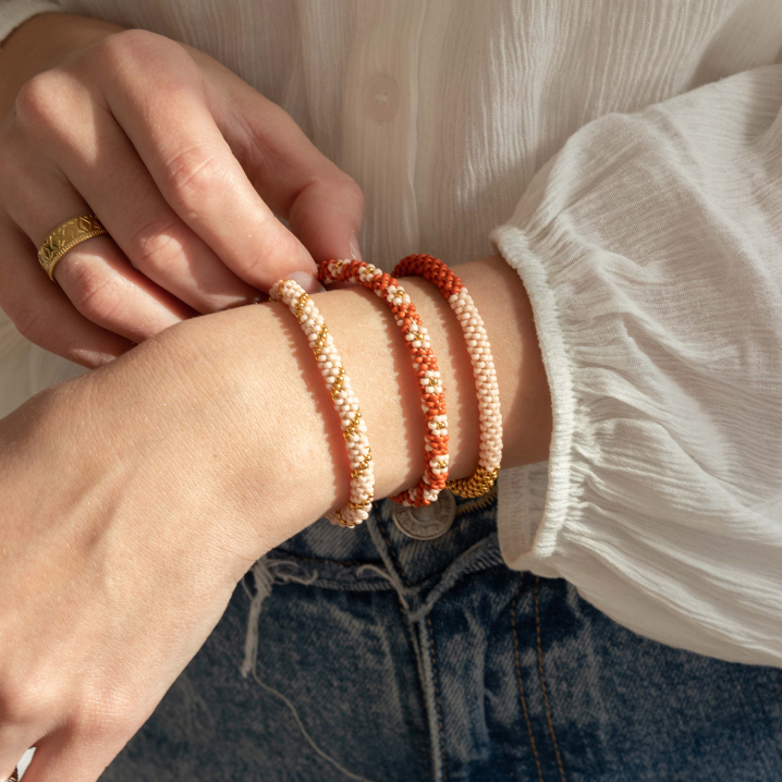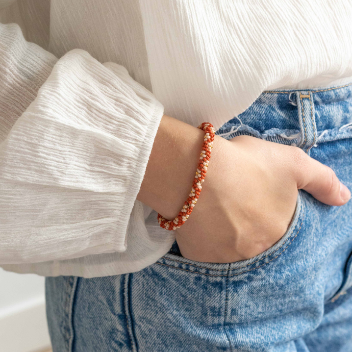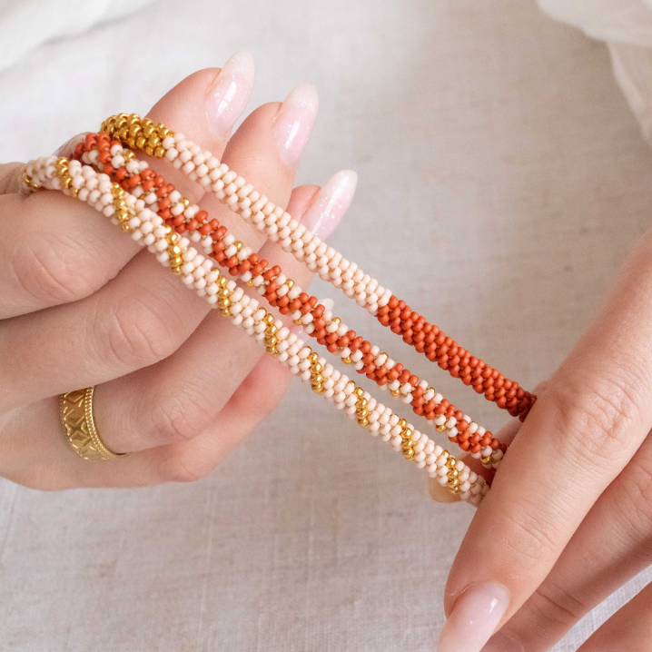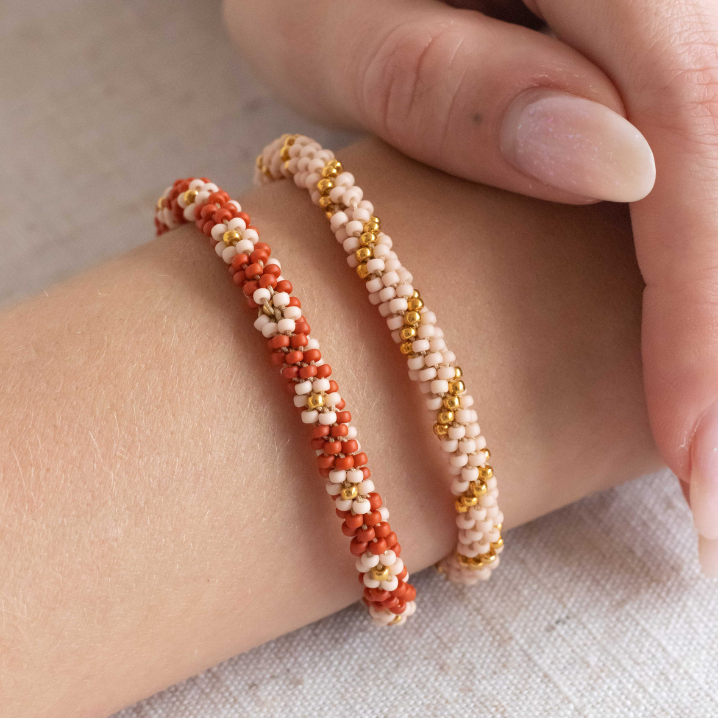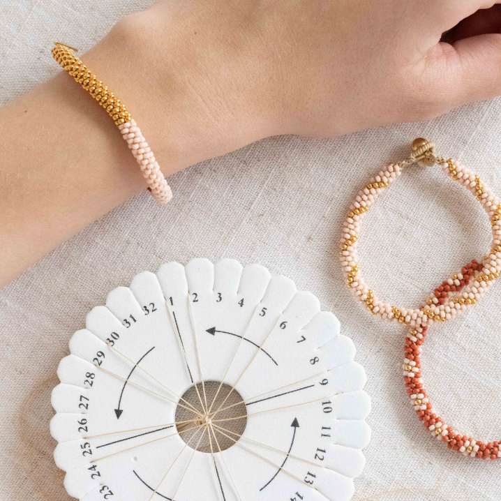 Dans cette box, découvrez la technique innovante du Kumihimo en apprenant à confectionner trois magnifiques bracelets tissés avec des perles miyuki.