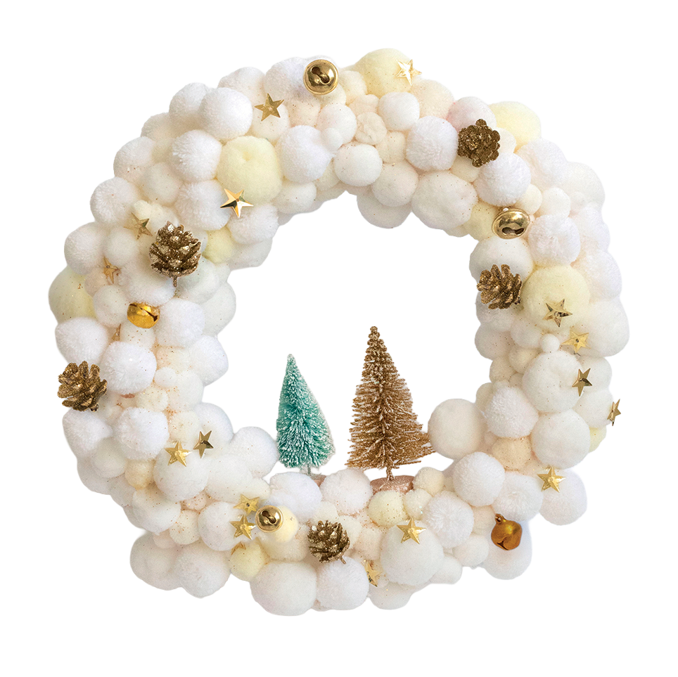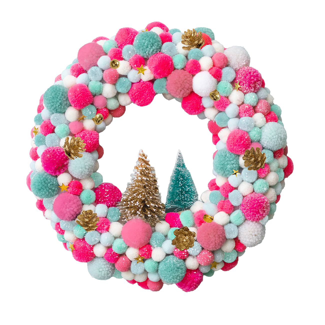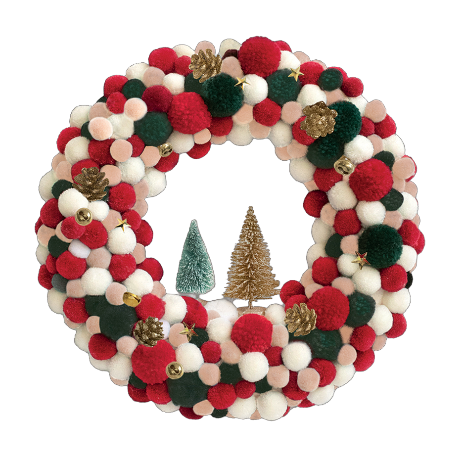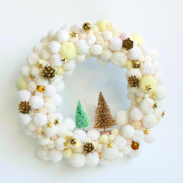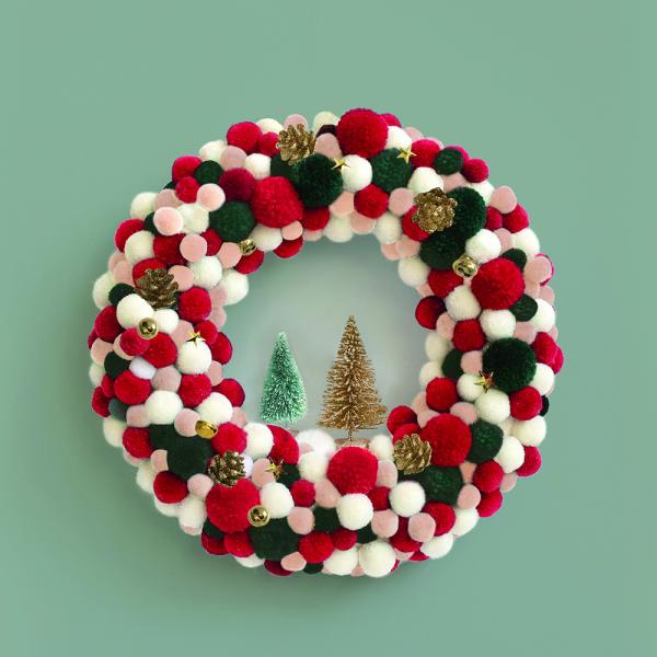 Créez une couronne pétillante et moderne aux couleurs vives : rose, bleu et blanc, parsemée de petits pompons, clochettes et pommes de pin dorées 🌈🎄